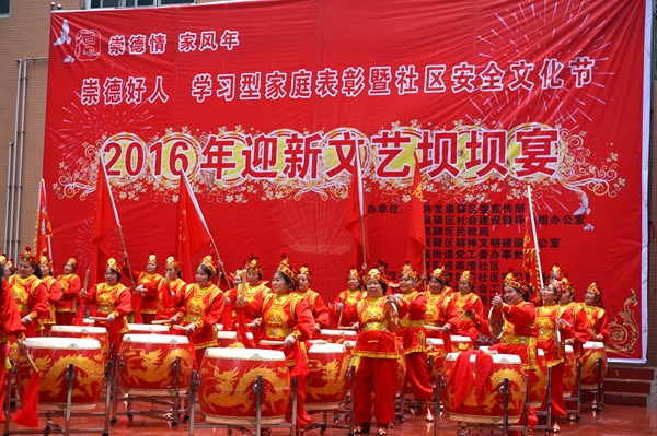 1月28日,在鏗鏘有力的鑼鼓聲中,崇德社區(qū)騰飛龍鑼鼓隊(duì)敲響了2016年新春好人表彰暨迎新壩壩宴的現(xiàn)場(chǎng),這臺(tái)自導(dǎo)自編自演的草根“春晚”是新市民集中居住區(qū)的老百姓自己的作品,雖然樸實(shí)無華,但卻展示了移民城市后新市民們振奮的精氣神,以及熱情洋溢奔向美好新生活的愿景。在歌曲《大中國》激越的節(jié)奏下,鑼鼓隊(duì)的表演者時(shí)而將鼓槌齊捶,時(shí)而隨著悅動(dòng)揮動(dòng)鼓槌敲擊鼓沿,留下滿場(chǎng)歡騰的鑼鼓聲,吸引了社區(qū)觀眾前來共賀新春。