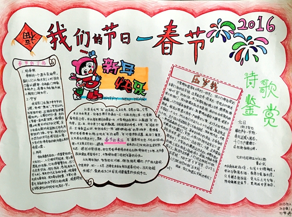 從1月1日進(jìn)入猴年開(kāi)始,崇州市各中小學(xué)便開(kāi)始組織學(xué)生利用課余時(shí)間制作猴年“春節(jié)”節(jié)日小報(bào),通過(guò)這種方式引導(dǎo)學(xué)生自主查詢、了解、學(xué)習(xí)春節(jié)知識(shí)。剪紙猴、卡通猴、鞭炮、紅燈籠、大福結(jié)、煙花,一個(gè)個(gè)帶著濃濃春節(jié)氣氛的元素被學(xué)生畫(huà)到節(jié)日小報(bào)上,再加上學(xué)生們親手抄寫(xiě)的春節(jié)來(lái)歷、春節(jié)習(xí)俗,每一張節(jié)日小報(bào)都透著濃濃的年味。