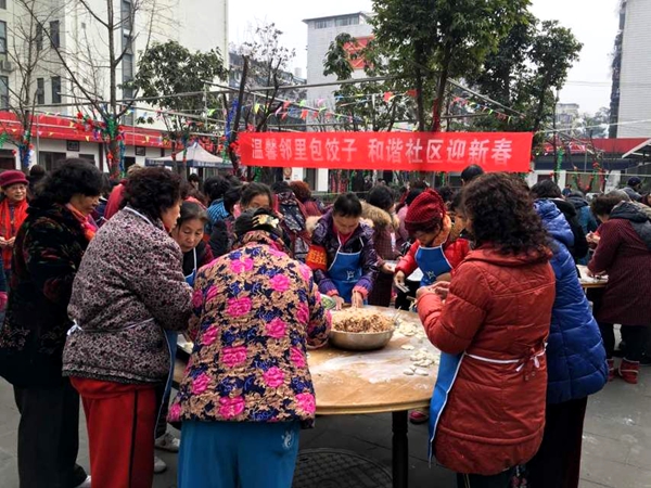 面粉100斤,韭菜,白菜以及豬肉等食材若干。來自社區(qū)的自愿者正熱情積極的參與本次活動,在活動的前一天他們便幫著搟面,準(zhǔn)備餡兒?;顒赢?dāng)天,社區(qū)工作人員以及社區(qū)志愿者更是一早就到金茂禮都廣場包餃子,社區(qū)還邀請了兩位老師,為大家書寫春聯(lián)。同時,四川電視臺的主持人也來到了現(xiàn)場,同社區(qū)群眾一起參加迎新春活動,現(xiàn)場充滿歡聲笑語,場面十分熱鬧,喜慶。在鄰里包餃子活動結(jié)束之后,便是新春匯演活動,活力四射的小朋友啦啦操,優(yōu)美動聽的合唱,多才多藝的社區(qū)的舞蹈讓現(xiàn)場觀眾目不暇接,新春匯演在一片歡樂聲中圓滿落幕。