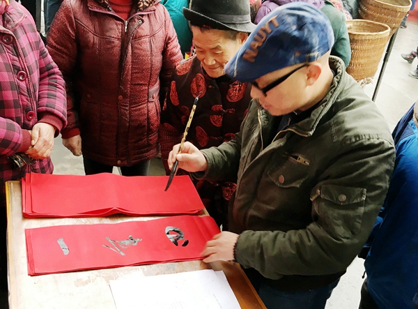 彭州文聯(lián)書法家協(xié)會(huì)的志愿者書法家們現(xiàn)場(chǎng)為老百姓書寫春聯(lián)