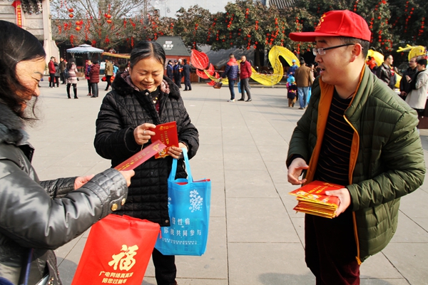 志愿者現(xiàn)場(chǎng)向游客派發(fā)“精神大紅包”