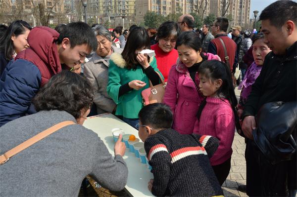 在元宵猜燈謎的活動區(qū),準(zhǔn)備答題的居民已經(jīng)排起了長長的隊(duì)伍,人群中,李先生一手握筆,一手拿紙,認(rèn)真地對著題板答題?!暗?5題,‘全是花’打一水果,我覺得謎底是草莓?!崩钕壬赜谐芍竦馗橛懻撝i題。李先生告訴我們,他已經(jīng)是第二次參加社區(qū)舉行的元宵民俗文化節(jié)了,比起去年,今年的活動人明顯多了,就連猜燈謎也得排隊(duì)等候,熱鬧的氣氛讓獨(dú)自在成都打工的他感受到了濃濃的節(jié)日氛圍。