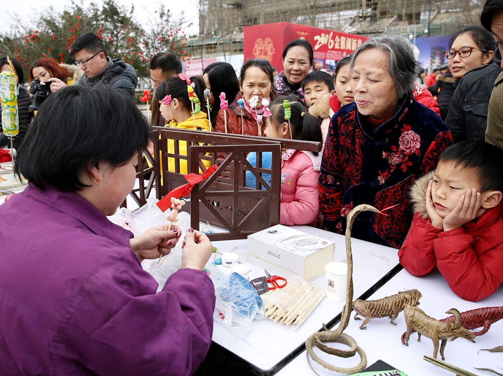 除了欣賞精彩的文藝表演外,活動現(xiàn)場,民間文藝互動展示區(qū)吸引了不少的市民和游客。剪紙、糖畫、棕編、面塑、蜀繡等民俗手工藝人現(xiàn)場制作展示,把大家的年俗回憶勾回了過去。