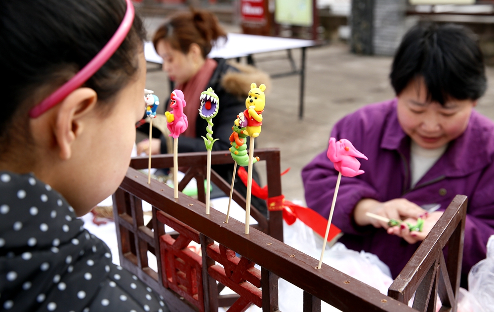 “小的時候經(jīng)常轉糖畫,拿在手里一整天都舍不得吃;女兒這輩,對糖畫就少了這一份味覺和視覺的記憶了?!笔忻駨埶磶е畠?,請?zhí)钱嬎嚾艘运麄兊纳ぶ谱髁恕罢T人”的糖畫,父女倆拿著糖畫,高興得樂開了花?!斑@樣的民俗展示,是傳承中華傳統(tǒng)文化的很好方式?!睆埶凑f。