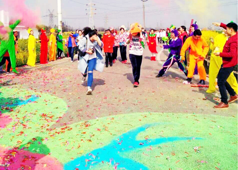 活動(dòng)當(dāng)天凌晨6點(diǎn)半,市文聯(lián)組織的本地藝術(shù)家、崇州市西部計(jì)劃志愿者就出現(xiàn)在開幕式彩跑環(huán)節(jié)的跑道上,用彩粉描繪五彩繽紛的春天氣息。一幅幅可愛的賞花節(jié)主題圖案,奔跑的自行車、歡笑的太陽花、五彩的風(fēng)箏、彩色的菜花節(jié)標(biāo)志,將全程5公里的彩色跑道變成一道“彩繪長(zhǎng)廊”。