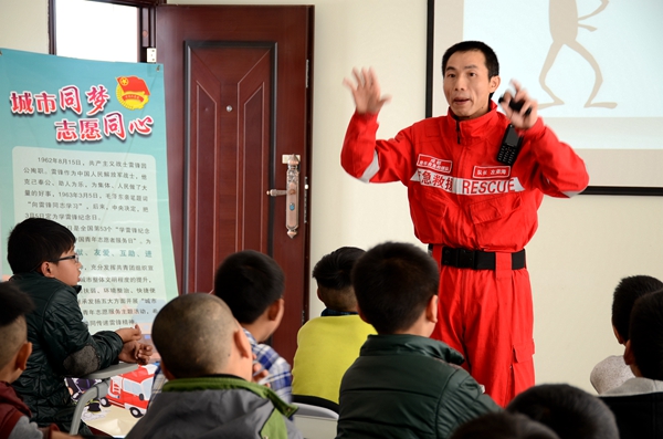活動(dòng)中,青白江區(qū)義工聯(lián)合會(huì)會(huì)長鐘城以 “城市同夢,志愿同心”為主題,和孩子們一起分享了雷鋒的感人故事,并齊唱《學(xué)習(xí)雷鋒好榜樣》。成都青年應(yīng)急救援隊(duì)隊(duì)長左弟海結(jié)合應(yīng)急救援的具體案例,向小朋友們講解了生活中的常見安全隱患、地震、火災(zāi)逃生自救互救要領(lǐng)及兒童防誘拐、防踩踏等安全防護(hù)常識(shí)。