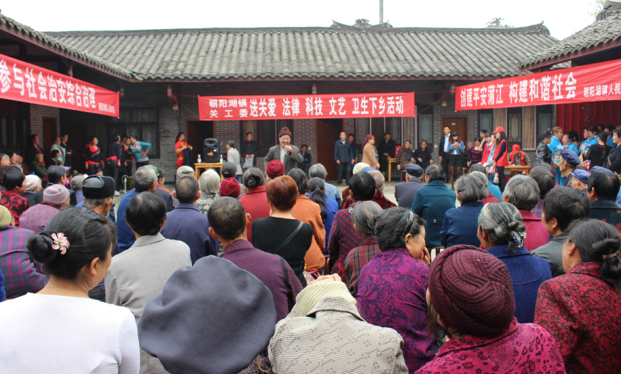 在文藝節(jié)目表演中,由朝陽(yáng)湖鎮(zhèn)各村社文藝隊(duì)伍創(chuàng)編的具體鄉(xiāng)土特色11個(gè)節(jié)目,有歌舞、有小品、有三句半,既娛樂(lè)了群眾的文化生活,又蘊(yùn)含孝、禮讓、安全等文明風(fēng)尚,讓觀看群眾在享受的過(guò)程中得到思想素養(yǎng)的提升。小品《惡媳婦轉(zhuǎn)變?yōu)樾⑾眿D》表演完后,現(xiàn)場(chǎng)響起熱烈的掌聲,現(xiàn)場(chǎng)群眾紛紛表示小品中那個(gè)不贍養(yǎng)老人的“惡媳婦”就應(yīng)該得到應(yīng)該有的懲罰。隨后,法律志愿者以案說(shuō)法,就農(nóng)村贍養(yǎng)、婚姻家庭、老年人權(quán)益保護(hù)等農(nóng)村常見(jiàn)的矛盾糾紛和法律問(wèn)題進(jìn)行法治宣講教育。