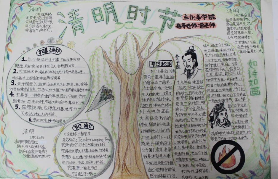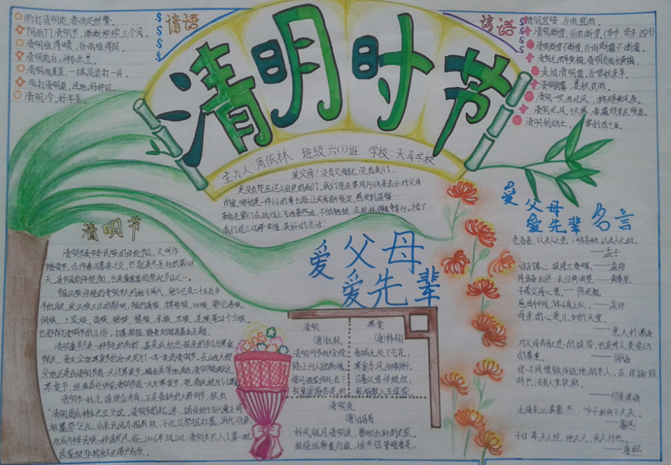 天馬學(xué)校周依琳告訴我們,“清明節(jié)在春天,而節(jié)日的習(xí)俗也是紀(jì)念先輩和感恩父母,因此我在節(jié)日小報(bào)里融入孝敬父母的元素?!毕矚g看書的她通過各種渠道收集資料創(chuàng)作出這幅作品。