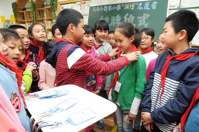 4月19日,為迎接“世界讀書日”到來,成都市錦里小學(xué)舉行“我是小圖書管理員”主題活動(dòng),60余名由該校學(xué)生擔(dān)任的圖書管理員志愿者正式上崗。小圖書管理員協(xié)助老師開展圖書管理工作是成都市錦里小學(xué)的優(yōu)良傳統(tǒng),專門成立了“潤博”志愿者隊(duì)伍專門協(xié)助圖書管理老師開展圖書管理工作。“潤博”的含義:潤物無聲,希望孩子們?cè)跁暮Q笾凶甜B(yǎng)生長,做一個(gè)博學(xué)之人,博愛之士!