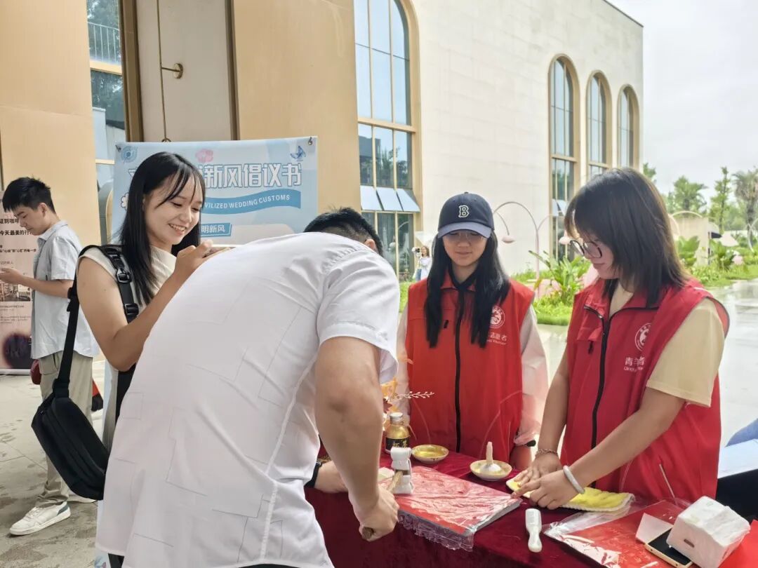 一大早,成都建工一建“青筑”志愿服務(wù)隊(duì)就來到了現(xiàn)場(chǎng),主動(dòng)向領(lǐng)證新人宣傳文明婚俗理念、協(xié)助打卡拍照,引導(dǎo)他們參與文明婚俗宣傳互動(dòng)游戲和非遺婚書拓印,并向他們送上新婚祝福。在文明婚俗宣傳點(diǎn)位,新人們認(rèn)真聆聽志愿者講解的文明婚俗理念,宣讀《文明婚俗新風(fēng)倡議書》,參與到“文明婚俗拼拼樂”互動(dòng)游戲中。在婚書拓印環(huán)節(jié),不少新人都表現(xiàn)出了對(duì)這一環(huán)節(jié)的認(rèn)可,“婚書拓印太有意思了,我準(zhǔn)備回去把它裱裝起來。”“我們準(zhǔn)備今年出去旅個(gè)游,順便結(jié)個(gè)婚?!爆F(xiàn)場(chǎng)設(shè)置的集體宣誓儀式更是將活動(dòng)儀式感拉滿,新人們手持結(jié)婚證立于花墻之下,共同許諾相守一生的誓言。在婚姻家庭咨詢處,高級(jí)婚姻家庭咨詢師為新人們送上“錦囊妙計(jì)”,提供專業(yè)婚戀指導(dǎo)。在主題打卡拍照區(qū),新人們沉浸在“氛圍感滿滿”的美陳設(shè)計(jì)中,記錄這“幸福瞬間”。