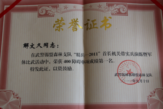 2011年9月,在武警錫盟森林支隊“精兵——2011”首長機(jī)關(guān)帶實兵演練軍體比武活動中,我以1分44秒的成績打破了400米障礙賽支隊記錄,獲得單項成績第一名。
