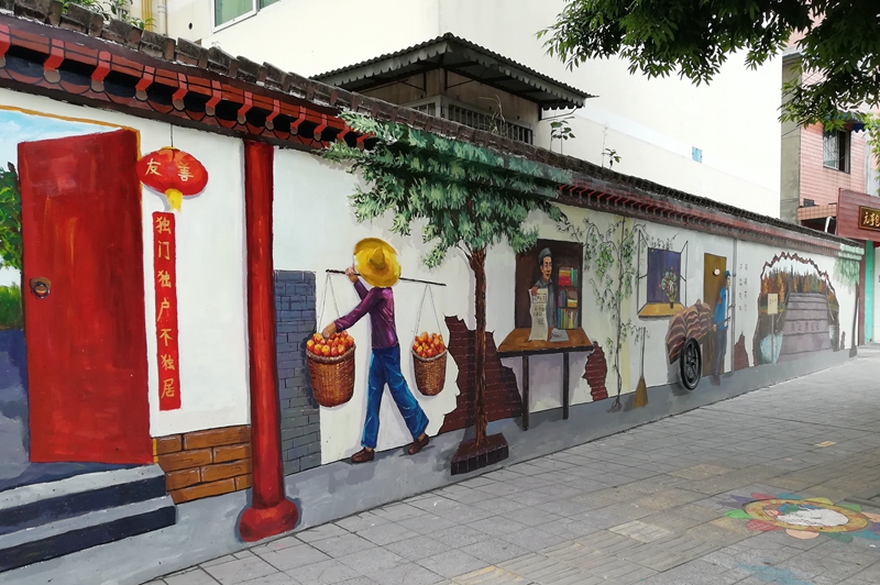 在成都市郫都區(qū)郫筒街道城東巷,這里的老舊院落建筑充滿了“年代感”,但在3D彩繪的襯托下仿佛又透出了“新鮮勁兒”。這是成都市郫都區(qū)郫筒街道岷陽社區(qū)根據(jù)自身特色,在背街小巷、一街一景中開展微視覺+微空間+微景觀+微鄰里=微更新“五微計劃”,讓居民共同改造不一樣的生活環(huán)境。